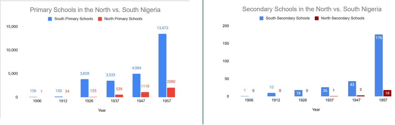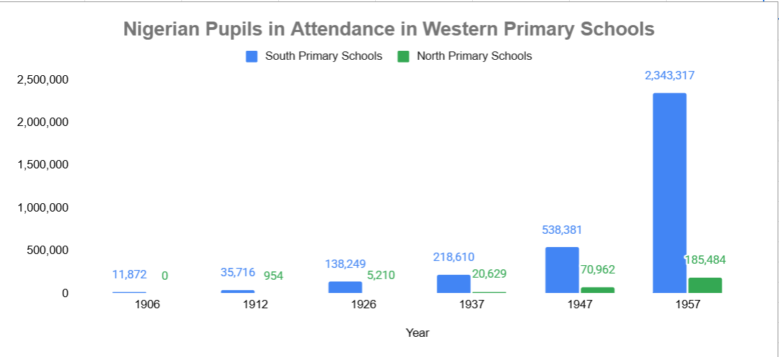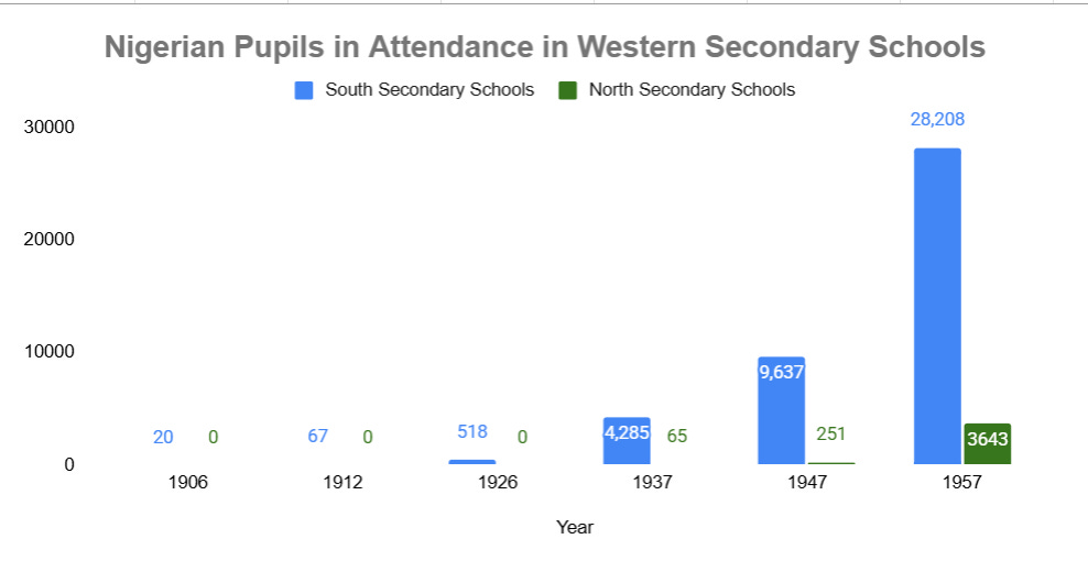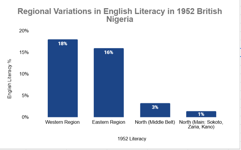 To be clear, the North did have literacy before and during colonialism. But instead of the Roman script, mainly male elites (clerics, poets, top merchants, emirs, judges, and court scribes) used Arabic script to write in Hausa Ajami, Fulani Ajami, Kanuri Ajami or Arabic. There were Koranic schools taught by Mallamai (Quranic teachers). But these schools did not prepare students for European-style civil services jobs.