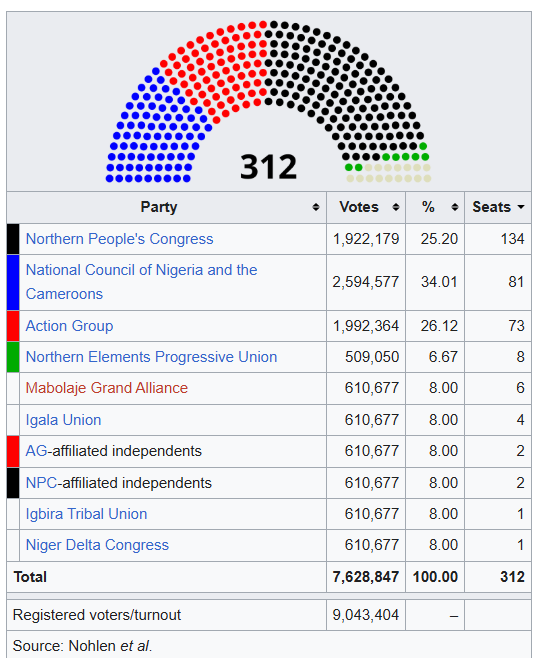 The Result: The NCNC and AG won more total votes than the NPC. But NPC had the won the most seats (Seats were allocated based on the Census. The game was tilted for the North to win).