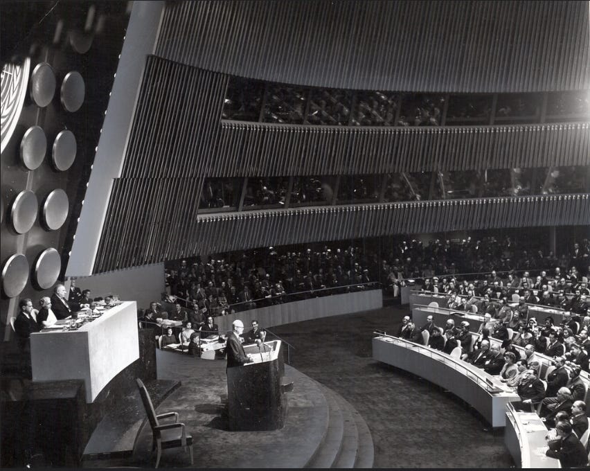 By 1953, Eisenhower realized that Truman’s strategy of “kicking away the ladder” from the 1946 Atomic Energy Act was failing. In a speech at the United Nations called “Atoms for Peace”, he proposed that nuclear technology should be shared internationally for civilian purposes like electricity and medicine.
