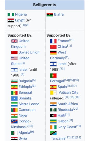 Fascist states like Franco’s Spain and Salazar’s Portugal, and Apartheid states like Rhodesia and South Africa also armed Biafra via Portugal’s Sao Tome and Guinea-Bissau. Presumably, all of them wanted Nigeria to lose its oil so it would stop funding Black African liberation movements on their territories. Biafra took their arms but still hated apartheid & colonialism.