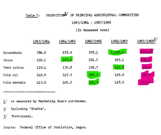 The war brought significant carnage and a massive decline in foreign investment (if we exclude oil investment, FDI in Nigeria went from £N 45M per year to £N 6M in 1966). This was particularly acute in manufacturing. Agriculture, livestock, and forestry production stagnated (which was most of the labor force back then).