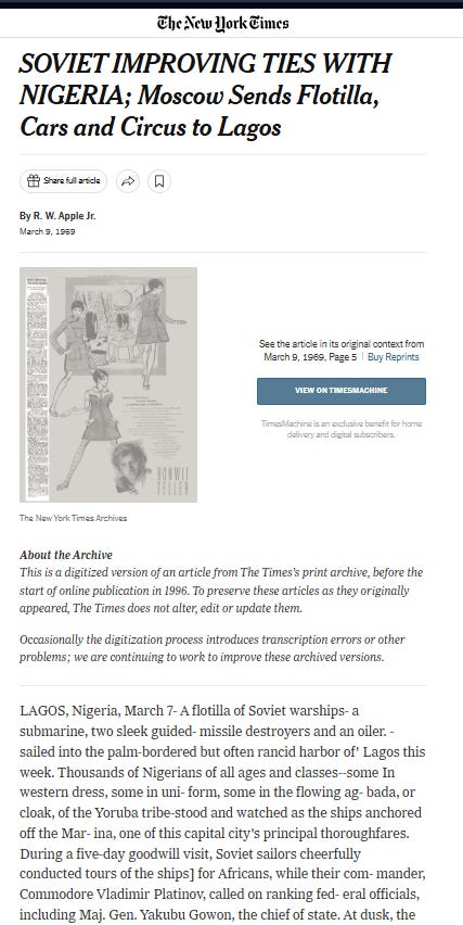 The Soviets sent ~50 technicians to help the Nigerian military maintain and operate the aircraft, offered $56M in economic credits, and increased scholarships for Nigerians to attend Soviet Universities. Lastly, Nigeria and the Soviet Union signed a $140M economic agreement which involved bartering weapons for cocoa.