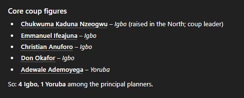 Ironsi declined to prosecute key coup plotters quickly. He leaned on Igbo advisers and accelerated Igbo promotions, violating the old quota equilibrium. Northerners interpreted these moves as Igbo favoritism, not national unity.