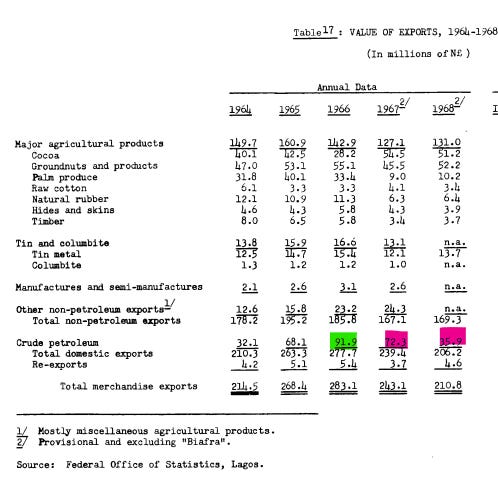 Lastly, due to the Biafra war, oil exports dropped. In 1966, crude oil was £N 91.9M ($257M) in foreign currency earnings (33% of Nigeria’s merchandise exports), but due to the Biafra war crude oil dropped to £N 35.9M ($100M) which was 17% of Nigeria’s merchandise export earnings.