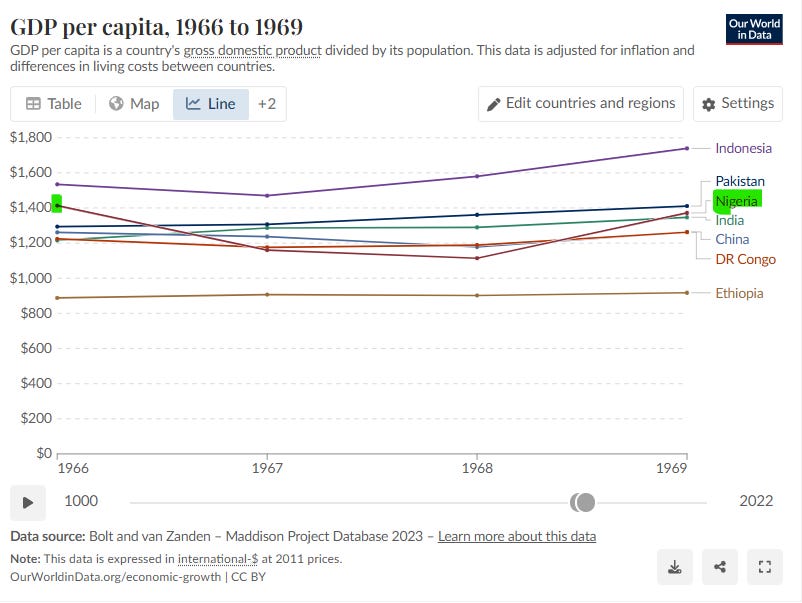 Before the war, Nigeria was catching up to states like Indonesia. By the war’s final year, Nigeria was poorer and was overtaken by Pakistan. But Nigeria was still ahead of India, Congo, and Maoist China.