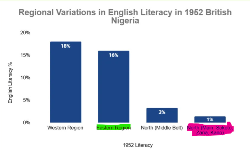 The South benefited from decades of missionary & colonial education before the North was colonized. One group, the Igbos of the Southeast, filled trading networks, railways, postal services, telecommunications, and civil service posts across the nation, even in the North. Northern English literacy rates lagged far behind. They usually read in Hausa-Ajami.