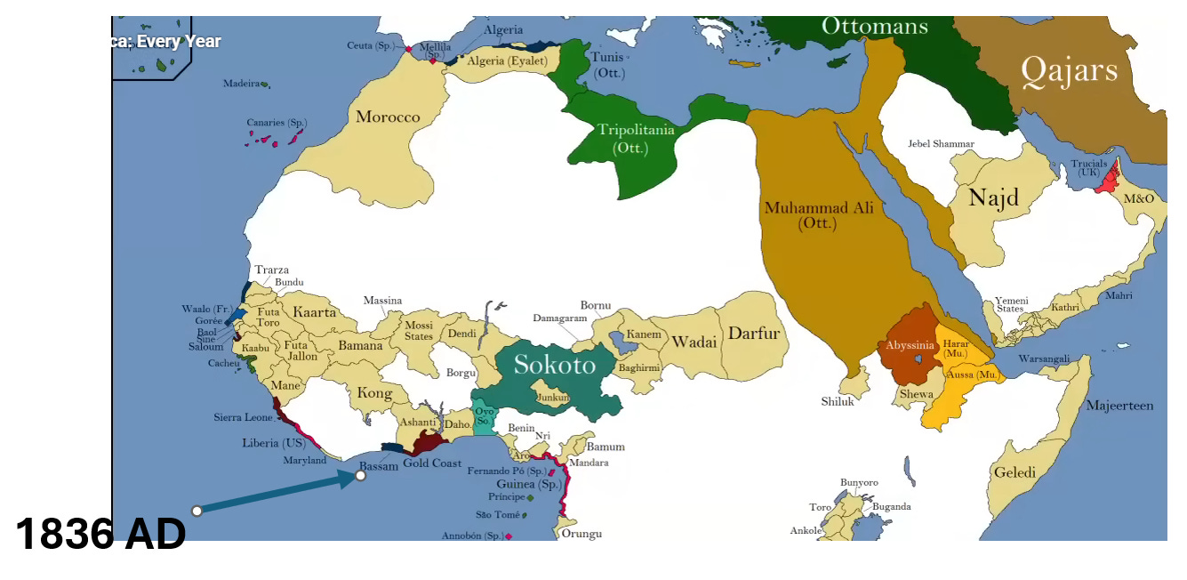 In 1818, Louis XVIII abolished the slave trade, so Bassam could no longer be a place to traffic slaves. Instead Bassam shifted to be a hub of “legitimate commerce” (palm oil, ivory, etc.).