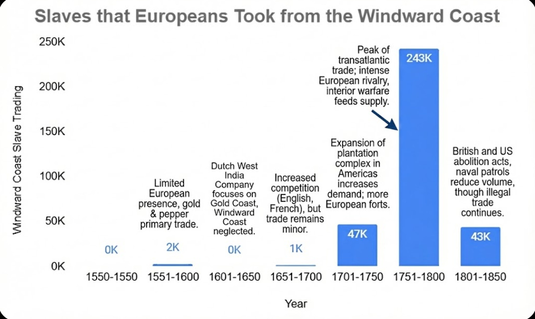 Scale: This region had the fewest slaves exported across the Atlantic. ~350K slaves were taken from this area over the 350 years, much less than the Gold Coast, where 1.2M were taken. This is because in the Gold Coast, the Ashanti were a slave trading machine.