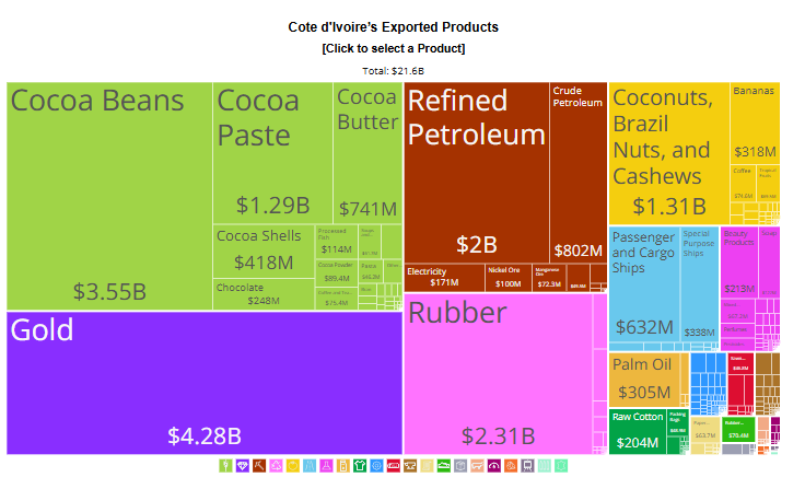 In terms of trade, Ivory Coast imports food, oil, medicine, cars machinery, and electricity mainly from China, France and Nigeria. 11% of the land is arable (land that can be ploughed and used to grow crops) which is used by 40% of the population to grow coffee, palm oil, groundnuts, rubber, and cocoa (the country’s #2 export). Ivory Coast’s other billion dollar exports are gold (#1), rubber (#3), refined petrol (#4), nuts (#5), and cocoa past (#6).