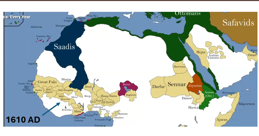 As for Mali, by 1610 AD, Mali fractured into petty chiefdoms. Only Mali-Kurussa bordered modern day Northern Ivory Coast, continuing their trade.