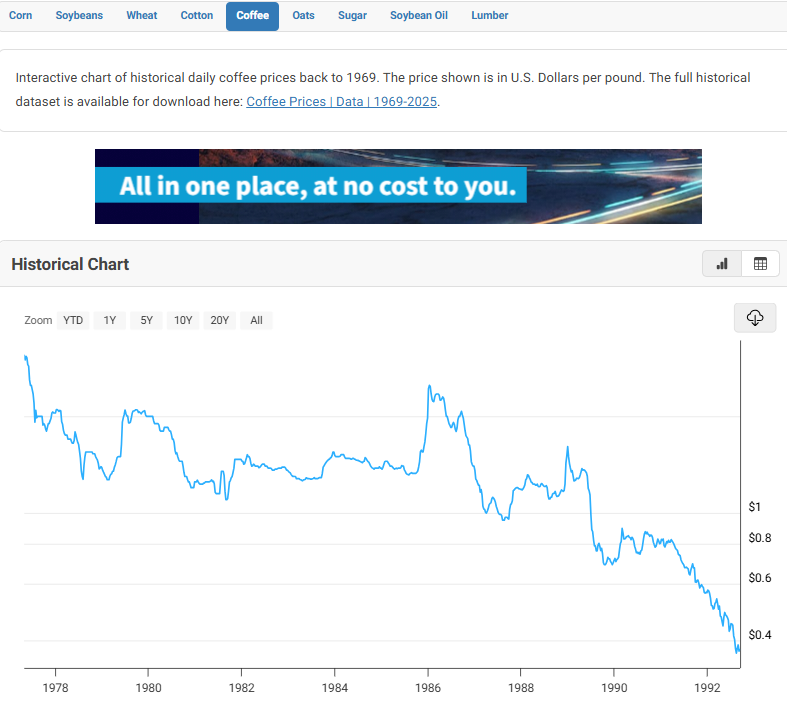 In the late 1970s, Ivory Coast’s principle exports crashed. Coffee went from $3.22 in 1977 all the way down to $0.38 by 1992.