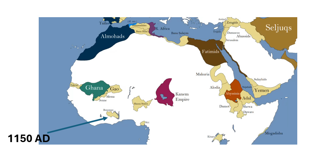Around the 12th century, Akan clans struck gold in the Bono Manso–Tain–Bia basin (where modern Ghana & Ivory Coast meet). Villages merged into chiefdoms, forming Bonoman, the region’s first major polity. See map below:
