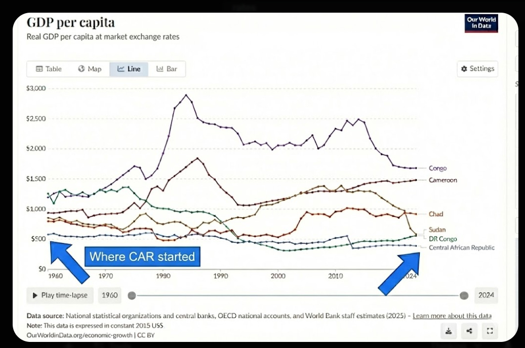 Sadly, CAR is one of the few African countries where people lived better in the 1960s than today, even after adjusting for inflation.